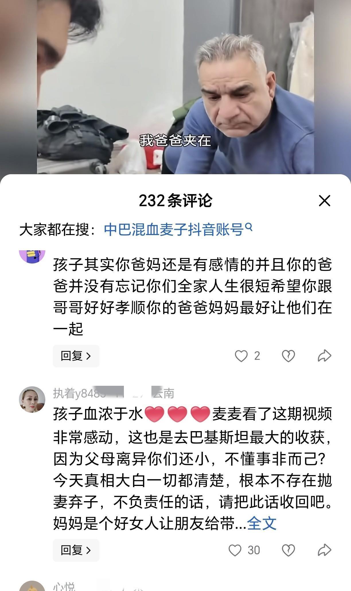 有人说:别忘记,是妈妈把你们养大的,如果有钱有能力要孝敬妈妈,而且妈妈还是没有房子呢,辛苦一辈子。主要是麦爸爸太能说会道,这些日子早就征服了儿子,让儿子理解自己的难处和情感。还一直说:希望两个儿子早日成婚,带着孙子来看自己,并一致表示麦妈妈在心中的位置,一直没有变过。这感情牌,搁谁都得迷糊了。不知道,这段感情以后如何维持?不过,小麦找到爸爸的同时,也收获了粉丝和流量,这份收获来一趟巴基斯坦也值了。